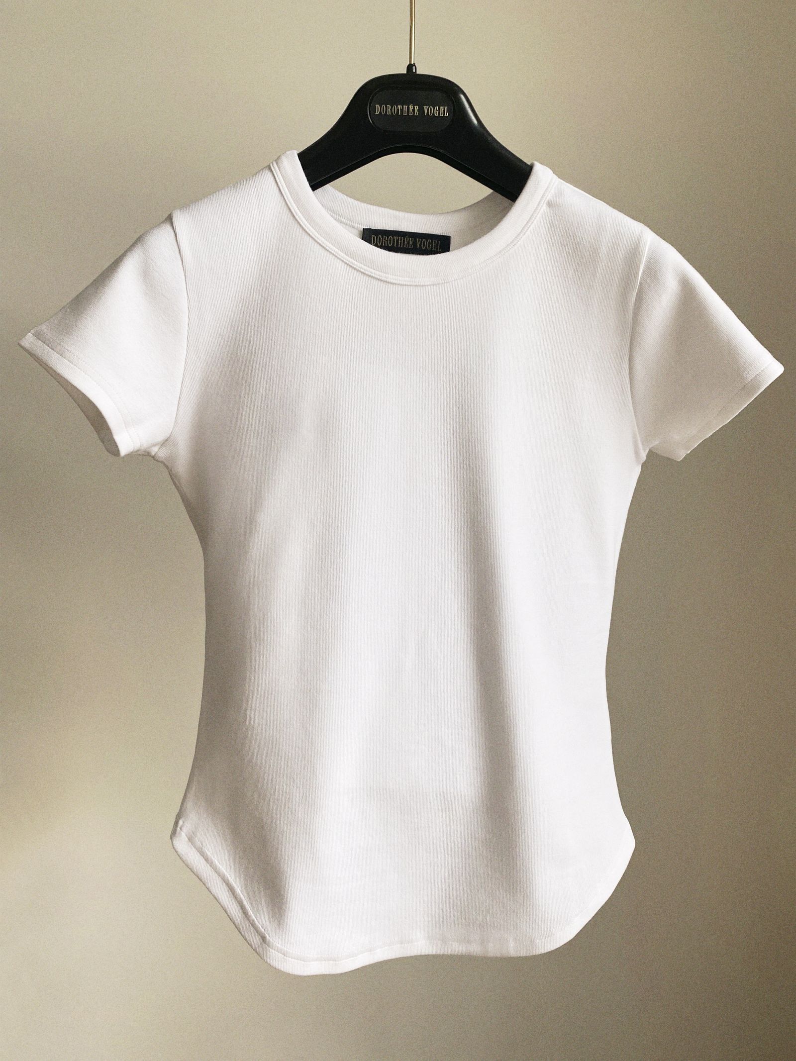 RIBBED T-SHIRT Style: 7101, Name: Ponza RIBBED T-SHIRTStyle: 7101, Name: Ponza, Qual: 410 Rib, Col: 10 white, Comp: 97% Organic Cotton 3% Lycra, Price: CHF 129.– incl.VATSIZES: (fabric is very elastic)Size S: OW/Chest 42cm Size M: OW/Chest 45cm